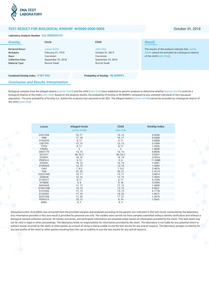 The Molecular Genetics Center «CDT» conducts genetic DNA testing to establish kinship between an aunt (or uncle) and a nephew (or niece). Our kinship DNA test reliably confirms relationships between both close and distant relatives.